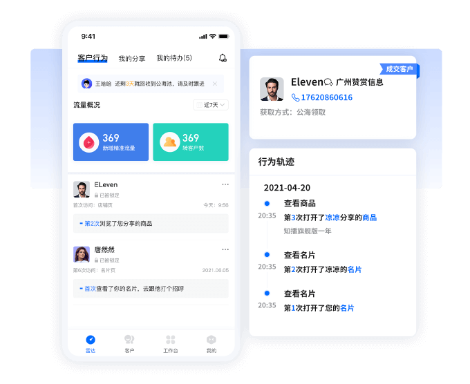 销售给客户发送可追踪的内容,自动追踪客户浏览行为,形成客户轨迹;捕捉客户多次打开内容的行为,提醒商机